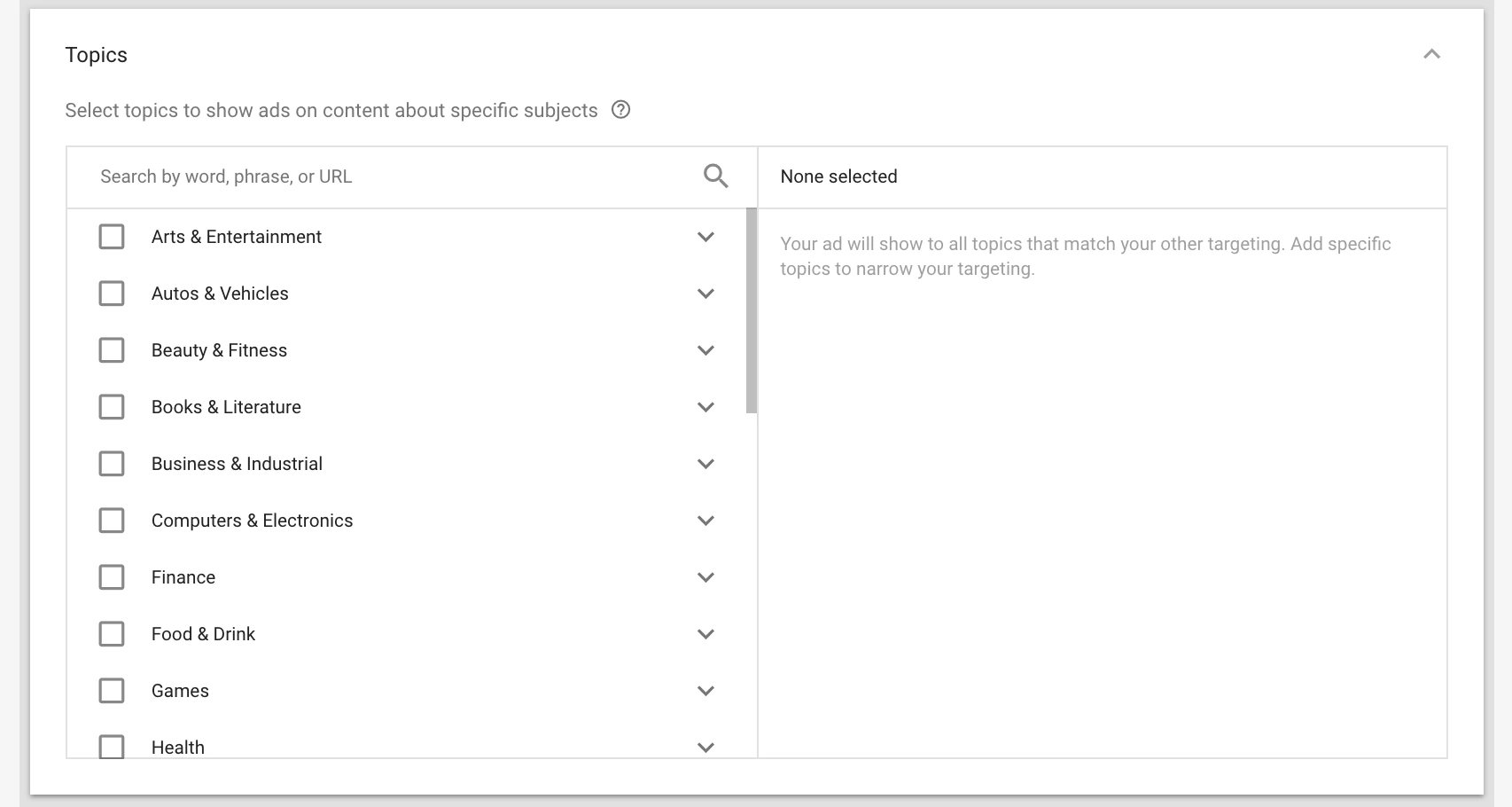 Interests: This is similar to Facebook but not as detailed, as you can narrow your audience down to their interests, hobbies, what they are researching, and of course a remarketing list, which includes how they interact with any of your online assets.