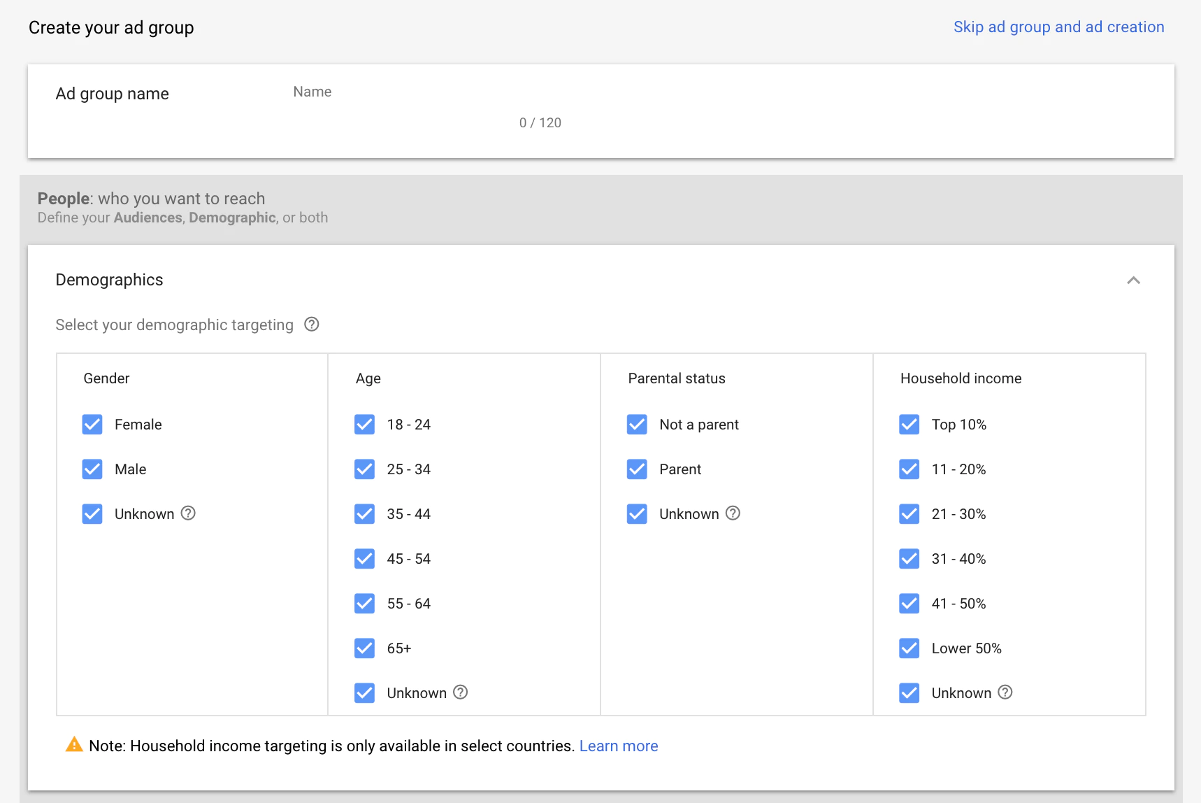 Demographics: The demographics here are your basics, and include gender, age group, life status (student, parents, homeowners, etc) and household income.