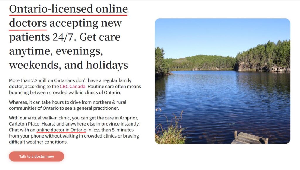 Take a glance at this page featuring online doctors in Ontario. It balances content relevancy and keyword frequency for local SEO, optimized with keywords like “Ontario-licensed online doctors” or “online doctor in Ontario.”