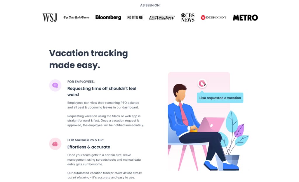 Flamingo is a leave management tool through Slack integration. Their homepage uses a clean structure and thoughtful spacing throughout. Each feature gets its own section with brief copy and visuals that demonstrate the tool in use.