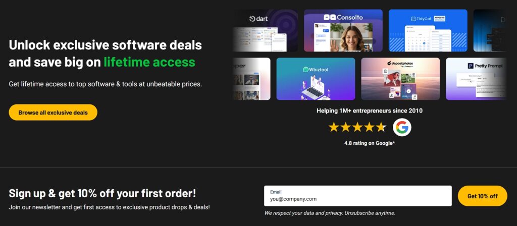 Another example is AppSumo, which offers limited-time deals on software and business tools. Their header includes a newsletter form that gives new subscribers 10% off their first purchase. Again, just one email field.