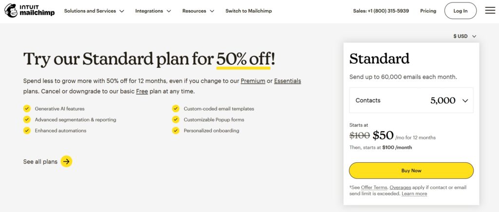 Mailchimp provides email marketing and automation tools for businesses of all sizes. Their homepage highlights a 50% discount on their standard plan, creating immediate financial appeal.
