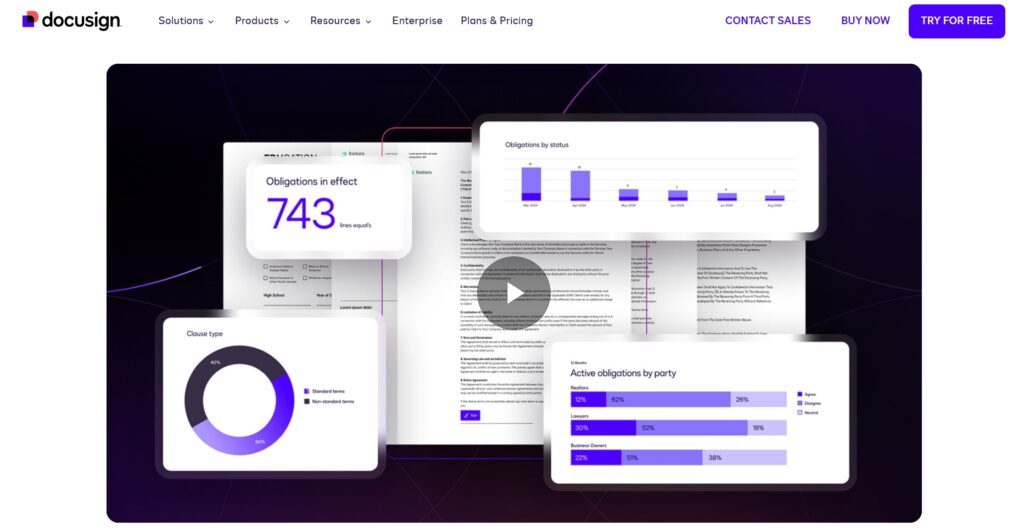 Docusign provides electronic signature and digital agreement management services. Their homepage features a concise, professional video that walks through what the platform does, the problems it solves, and why businesses trust it.