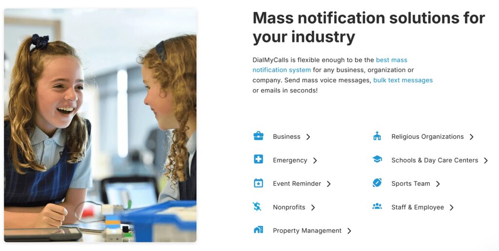 DialMyCalls offers mass text and voice messaging services for organizations that need to reach large groups quickly. Their homepage includes a section called “Mass notification solutions for your industry” that acknowledges that their platform works across different sectors.