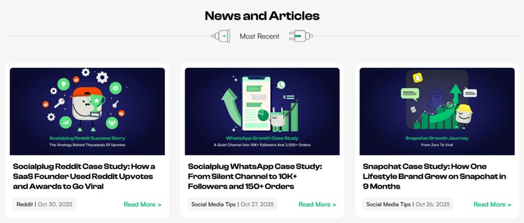 Socialplug operates a marketplace where users can purchase social media engagement, like followers, likes, views, and comments. Their homepage features a section displaying recent blog posts, many of which are detailed case studies.