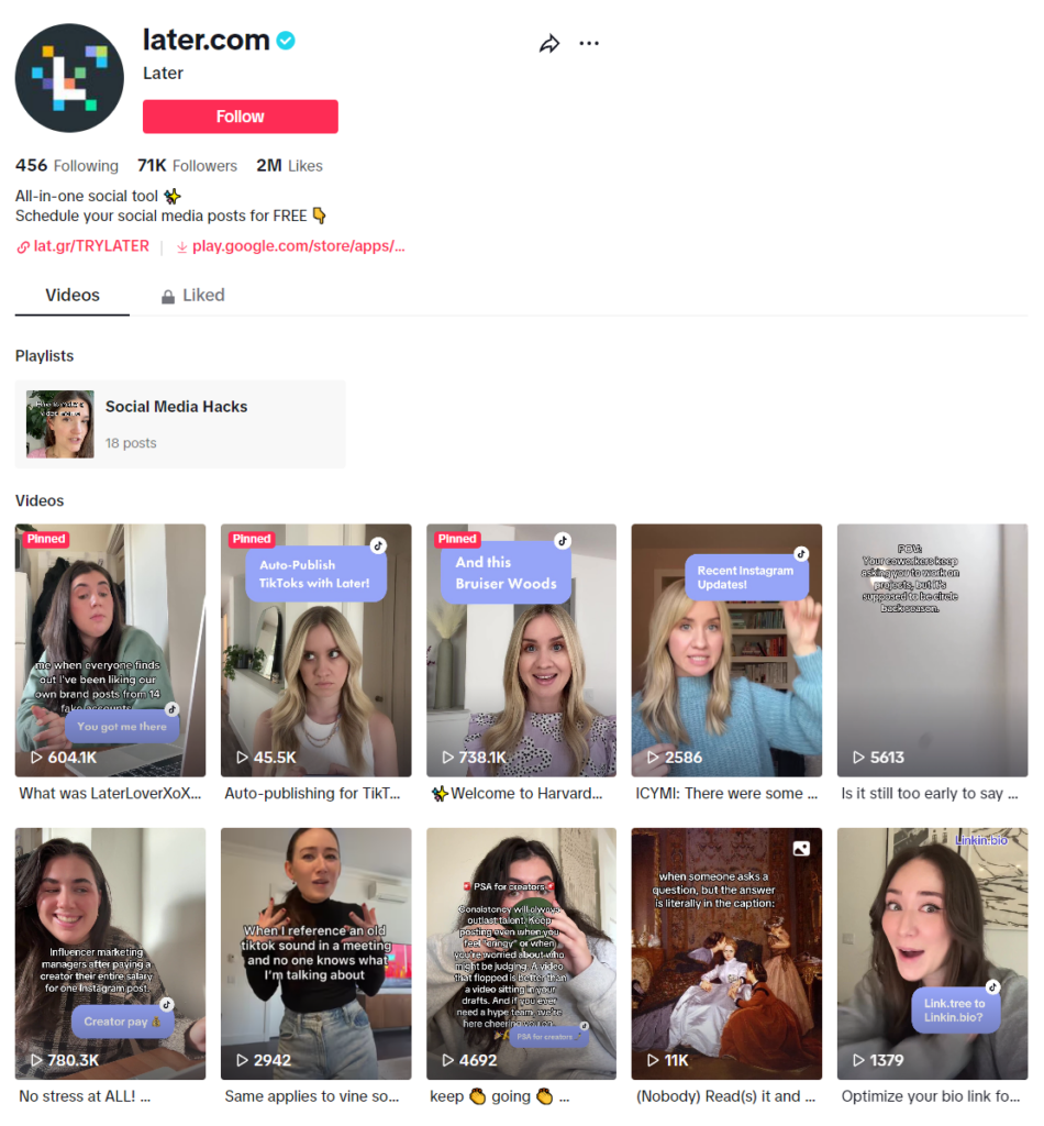 Later also features how-to videos about Instagram and other social media marketing tips on LinkedIn, Pinterest, Instagram, Facebook, X, and TikTok.