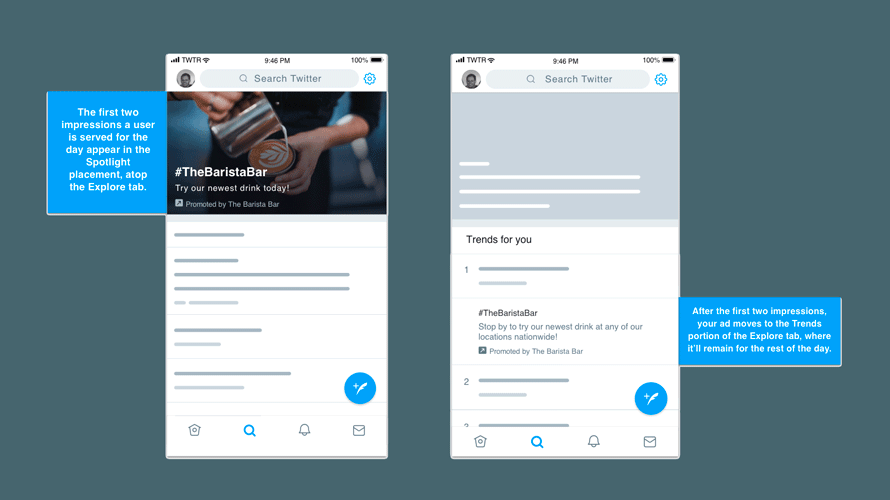 A Promoted Trend will show as one of the first spots under the “Trends for you” section, both in the Explore tab and in the timeline.