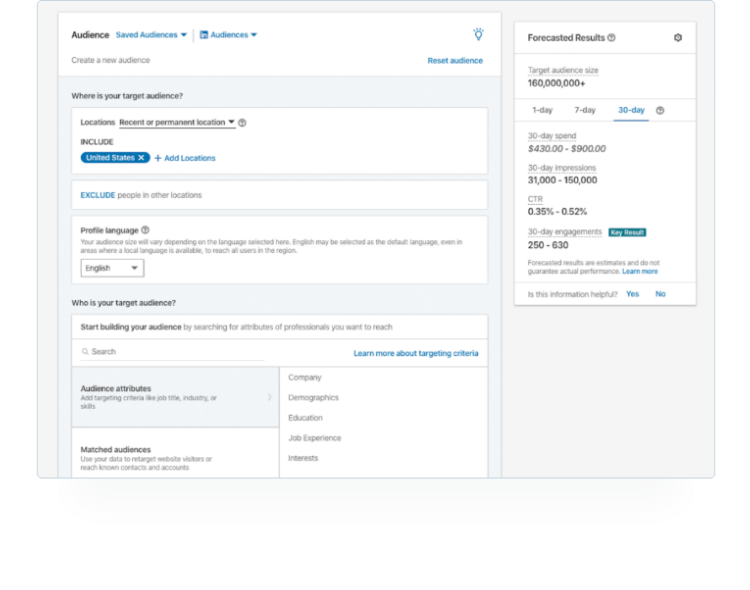 LinkedIn provides more than 20 different audience attribute categories to help you target the right audience for your campaigns. These include Company size, Company name, Member interest, Skills, Job title, Job seniority, and more. The platform will also show you forecasted results based on the attributes you have selected, including the estimated target audience size, the projected range of Click-Through Rates, and the expected number of Leads where applicable.