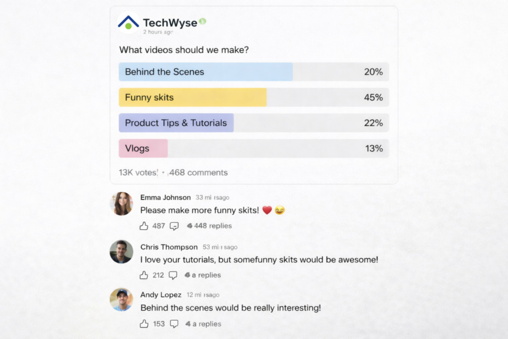 Your audience can be one of your best sources of inspiration, especially when you ask them directly. Using YouTube’s community tab, Instagram polls, LinkedIn reactions, or email surveys, you can gather insights about what your viewers actually want to see.