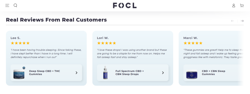 FOCL, a brand specializing in plant-based wellness solutions, gets this right. On their products for sleep category page, they display customer reviews alongside star ratings.