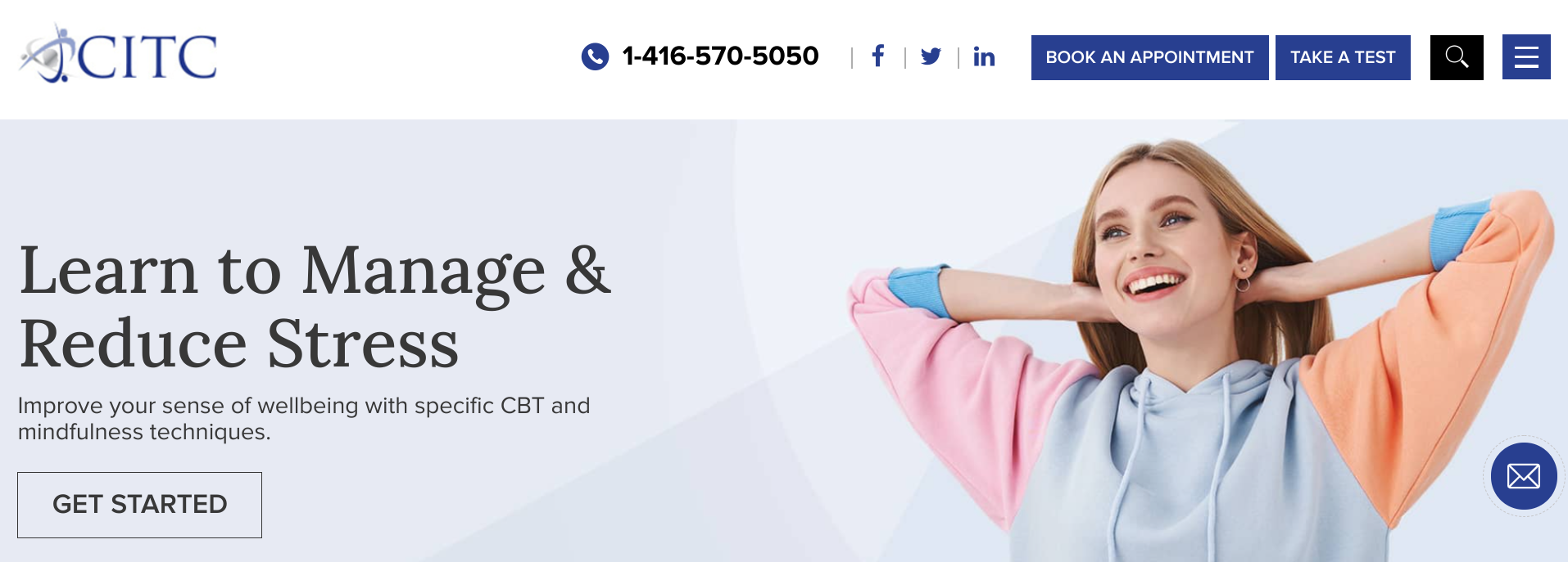 For example, the Cognitive & Interpersonal Therapy Centre (CITC) works closely with individuals struggling with anxiety, depression, and other mental illnesses. As you can see in the image below, their header text uses a typographic hierarchy. The main goal of the CITC is to help individuals manage their mental illnesses, so the first and largest text immediately offers this added value.